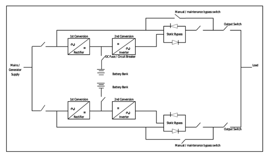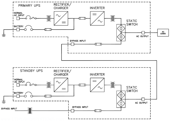 İki UPS, bir UPS’nin yükü besleyeceği diğer UPS’nin statik anahtara giriş yapılarak elde edilir.Yükü besleyen UPS arızalandığı durumda by-pass çalışmaya geçeceği var sayılarak süreklilik sağlanması düşünülmüştür.